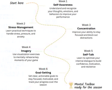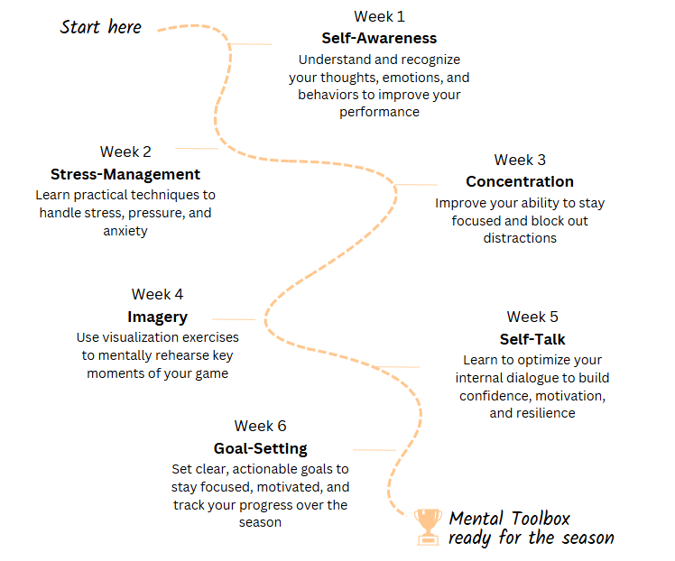 ⚽ Each week, you will focus on a key mental skill, ranging from stress management to concentration, visualization, self-awareness, self-talk, and goal-setting.